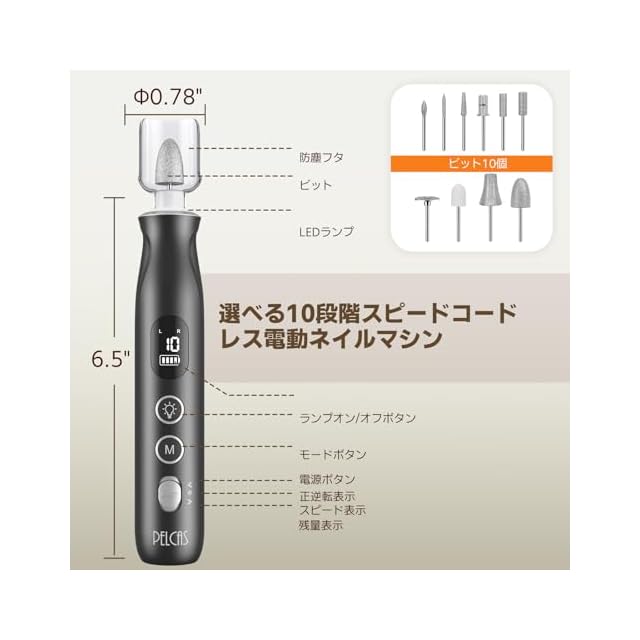 商品名:PELCAS電動ネイルマシン 10個のビット ネイルマシーン ジェルネイル オフ キットネイルケアセット 爪磨き グレー
