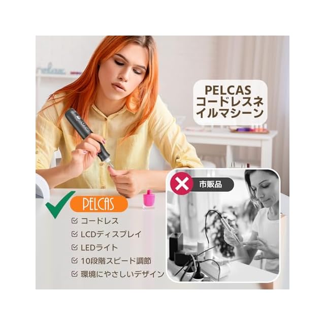 【オールインワン、10in 1多機能ネイルケアセット】付属品:ビット*10 サンドングバンド*60、掃除ブラシ*1(取り外せるネイルビットは10個付属されております。) 爪の形と長さを整え、甘皮処理、爪表面を磨きなどジェルを塗るまでの下準備は全部PELCAS電動ネイルマシン一台にお任せください。人力で爪削り作業より、お手数もご時間も省くことができます。ジェルネイルを乗せる前に楽々に爪を最適な状態をつくられ、作業の効率がアップします。