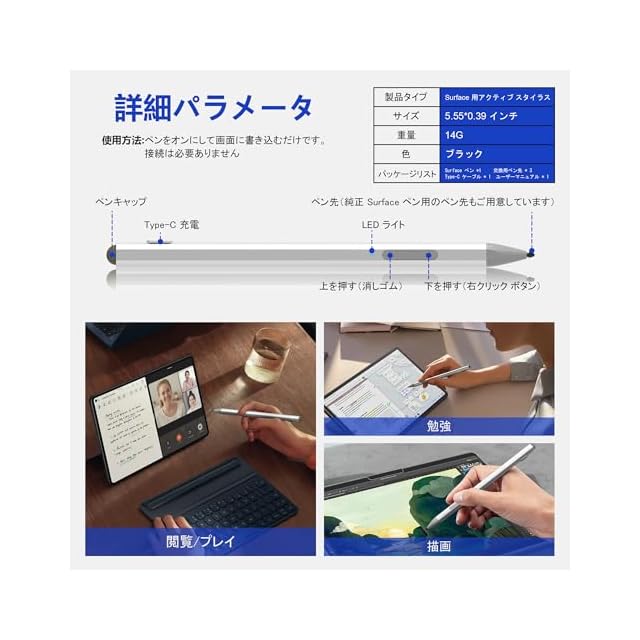 <p><b>Windows Microsoft Surface 用のスタイラス ペン。自然に書いたり絵を描いたりできます。制限なく作成する</b></p><p><b>ハイライト:</b></p><ol> <li>ペンには充電式バッテリーが内蔵されています</li> <li>Type-C急速充電設計</li> <li>60時間の書き込みをサポート</li> <li>LED充電インジケーター</li> <li>パームリジェクション機能</li> <li>4096 の筆圧感度レベル</li> <li>交換可能なペン先</li> <li>磁気吸着機能</li> <li>右クリックと消しゴムキー</li> <li>任意のキーを押すだけで入力を開始できます</li> <li>ドライバーやBluetoothは不要です</li> <li>静電容量式ペンキャップ</li></ol><p><b>磁気吸着</b></p><p>Surface スタイラス ペンは、Microsoft Surface に磁石で取り付けることができます。</p><p>Surface の側面にしっかりと取り付けられるので持ち運びに便利で、使用していないときにペンが滑ったり、紛失したりするのを防ぎます。</p><p><b>右クリックと消しゴムボタン</b></p><p>上ボタンをクリックして色選択機能を実行します (マウスの右ボタンと同じ)。</p><p>下ボタンをクリックすると、アーティストに最適な消しゴム機能が使用できます。</p><p><b>正確かつスムーズ</b></p><p>軽いタッチに反応する 4,096 個の圧力ポイントを使用して、正確にスケッチしたりシェーディングしたりできます。</p><p>インクは、実質的に遅延なく Surface ペンの先端から画面に流れます。</p><p><b>スマートチップと保護装置を内蔵しており、安全かつ安定した充電が可能です。</b></p><p>短絡保護</p><p>過電流保護</p><p>温度保護</p><p>過電流保護</p><p>サージ保護</p><p>過充電保護</p>