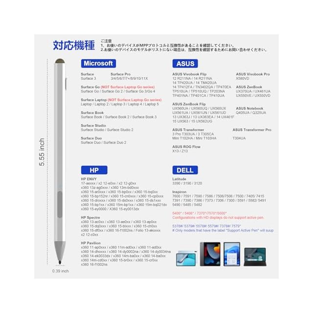 [互換性と品質サービス]: Surface タッチペンは、Surface Pro 3/4/5/6/7/8/9/X/10/11、Surface Book/Book 2/Book 3/Book 4、Surface Laptop/Laptop 2/Laptop 3/Laptop 4/Laptop 5/Surface Studio/Surface Duo などと互換性があります。ASUS/HP/Sony/Dell シリーズにも対応しています。製品に関して何か問題があった場合は、お気軽にご連絡ください。(より互換性のあるHP、ASUS、DELLモデルについては、お問い合わせください。)パッケージ:チップ付きMicrosoft Surfaceペン1本、USB-Cケーブル1本、交換用チップ3本、ユーザーマニュアル1本。