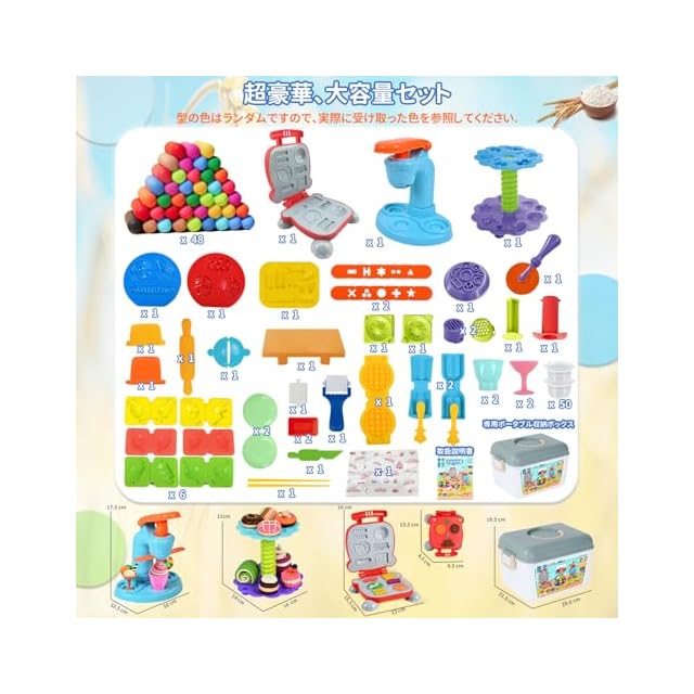 【かなり充実した内容】大容量の48個入りで、アイスクリームマシン、デザートテーブル、パン焼き機、寿司型、空のプラスチックカップ50個、高品質の収納ボックス1個、説明書の日本語(挿し絵はついています)。すごく盛りだくさんで豪華なセットです。