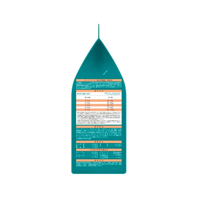 成分:たんぱく質:34%以上、脂質:14%以上、粗繊維:3%以下、灰分8.5%以下、水分12%以下、370kcal / 100g