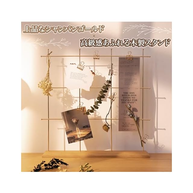 上品なシャンパンゴールドのワイヤーフレームと、しっかりとした木製スタンドが美しく調和した、自立式の卓上ディスプレイフレーム。付属のメタルクリップ10個で、写真やメモはもちろん、ピアスやネックレスなどのアクセサリーも自由にディスプレイ可能。見せる収納として、普段使いはもちろん、結婚式や誕生日パーティーなどのウェルカムスペースにもぴったり。置くだけでおしゃれな空間を演出できる、実用性とデザイン性を兼ね備えたインテリアアイテムです。