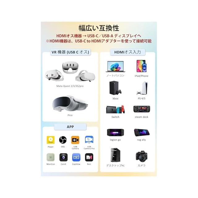 【強力な互換性】: HDMIキャプチャーカードは、すべての種類のVR眼鏡(Meta Quest 2/3/3s/Pro、Picoなど)と互換性があります。ラップトップ、コンピュータコンソール、タブレット、携帯電話など、さまざまなシステムやデバイスに対応しています。さまざまなアプリ(OBS、USBカメラ、プレーヤーなど)とも互換性があります。さまざまなゲームデバイス(Switch、Xbox、PS4/5/5Pro、Steam Deck、カメラなど)とも互換性があります.