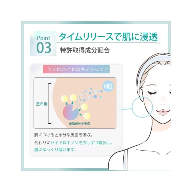 【浸透持続型ナノ化ハイドロキノン】ナノ化ハイドロキノンを配合!ナノ化することで浸透力(※1)、持続力を高めたハイドロキノンになります。※1角質層まで
