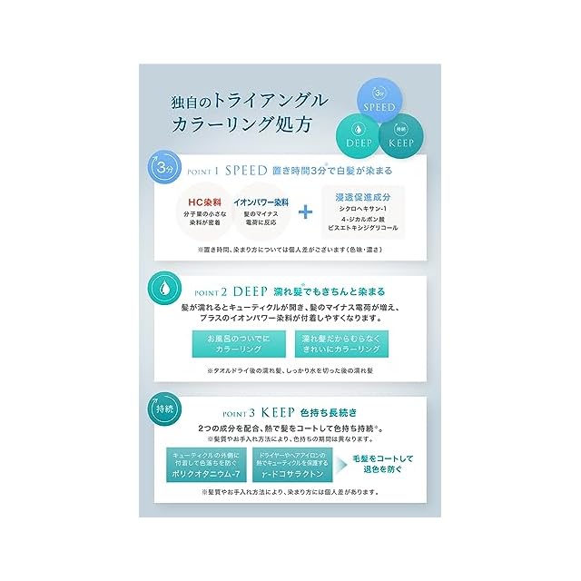 ✅【Speed・たった3分で白髪が染まる】キューティクルを傷めずに毛髪内部に浸透する「HC染料」と、毛髪を構成しているケラチンタンパク質のマイナス電荷と結合する「イオンパワー染料(塩基性染料)」の2種類の塗料を配合し、早く染められるようにしました。さらに浸透促進成分配合で、毛髪への染料の浸透を促進し3分*で白髪が染まります。※髪質やお手入れ方法により、染まりには個人差があります。