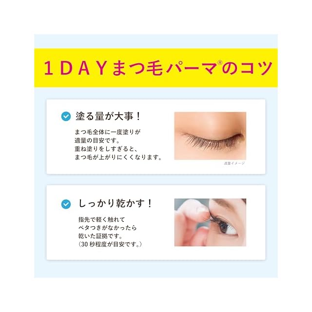 使用方法: ①まつ毛全体に本品を1度塗り ※塗布量が多いとまつ毛が上がりにくくなります。 ②しっかり乾かす ※指先で軽く触れてベタつきがなかったら乾いた証拠です。(30秒程度が目安です。) ③ビューラーでまつ毛を上げる その後マスカラ等普段通りのメイクをしてください。