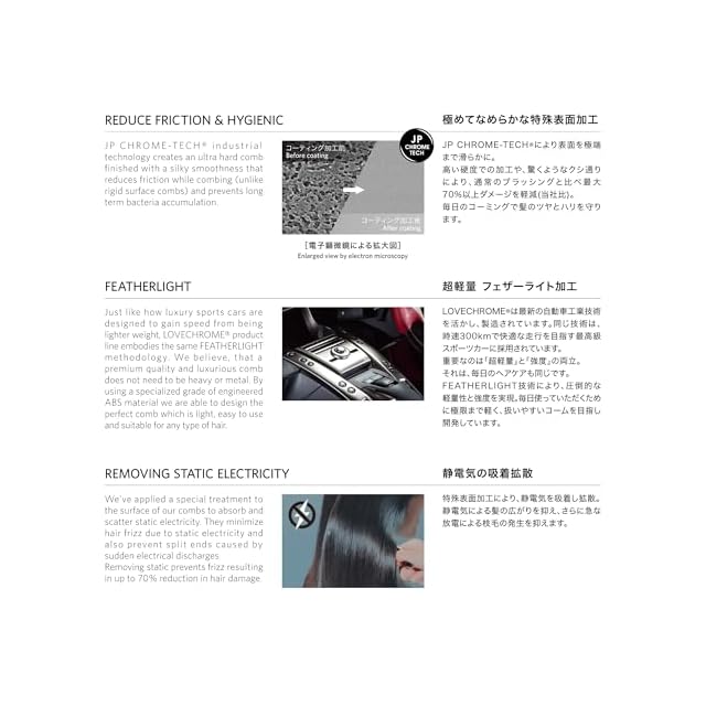 【極めてなめらかな表面加工】:日本の工業技術「JP CHROME-TECH」により、滑らかな表面加工が接触摩擦を最小限に留め、髪へのダメージを削減します。さらに、微細な空洞をふさぎ、汚れもつきにくくなっています。