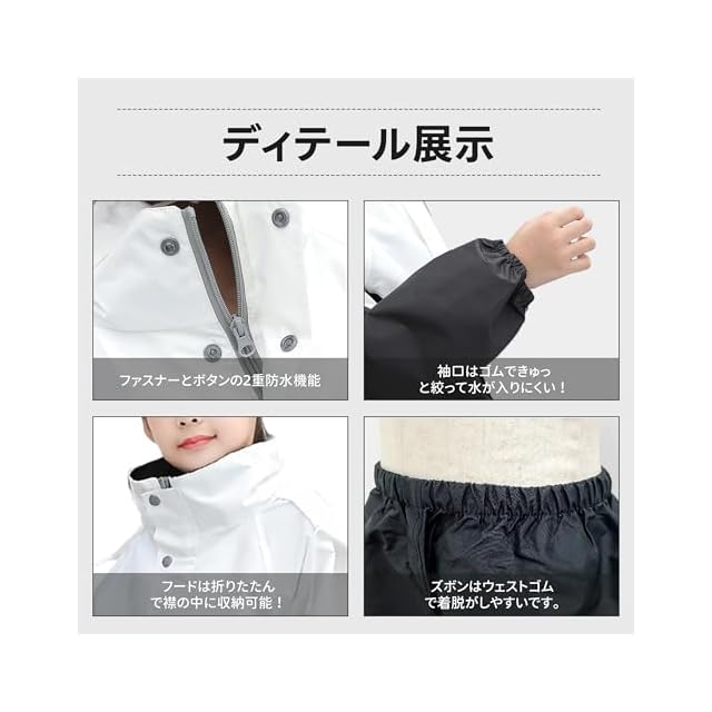 【しっかり防水】ファスナーとボタンの二重仕様になっているので、雨を完全に防いでくれます!袖にはゴムが入っているため、しっかり留まって水の侵入を防ぎます。