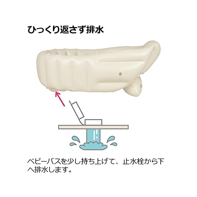 ストッパーが赤ちゃんのずり落ちを防ぎます。背中にぴったりフィットして、姿勢をキープします。腕にやさしい横空気層と、丈夫な縦空気層のWエア構造です。座った体勢がつらいときは、シンクでも沐浴できます。