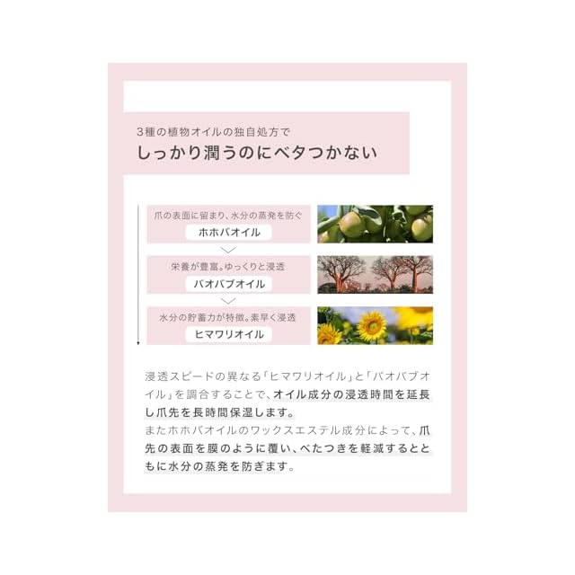 3種類の植物オイル(ホホバオイル,ヒマワリオイル,バオバブオイル)で爪先を潤し、ホワイトリリーの上品な香りが広がります。