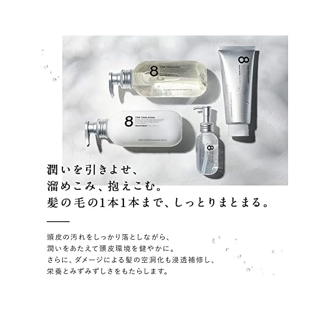 幹細胞エキス*と、海洋由来成分などを贅沢に配合した「タラソ幹細胞処方」の美容液シャンプーと美容液トリートメント。ダメージを受けたパサつきがちな髪に、水分を届けて束縛。乾燥しがちな頭皮も保湿して美髪作りをサポートし、髪がぷるんと潤い毛先までしっとりまとまります。キメ細やかでクリーミーな泡立ちのシャンプーが、頭皮と髪の汚れを優しく落としながら潤いを与えます。さらに美容液をリッチに配合したトリートメントで、ダメージによる毛髪の空洞化とキューティクルの剥がれを補修。使い続けるほど、髪の水分と油分のバランスを整え、潤いに満ちた「ぷるん髪」へと導きます。心地よく香るやさしいアクアホワイトフローラルの香り。* クリスマムマリチマムカルス培養液、リンゴ果実培養細胞エキス、ブドウ果実細胞エキス、アルガニアスピノサカルス培養エキス(全て保湿)