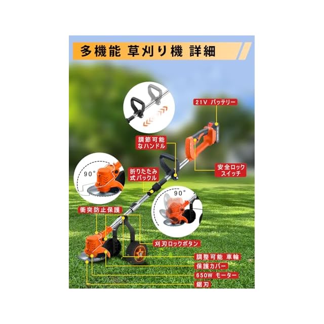 【2025新登場&強化版】充電式草刈り機 草刈り機 芝刈り機 コードレス 4種類の替刃 大容量バッテリー2個 18vマキタバッテリー互換 伸縮式 脱着式補助輪 一台多役電動草刈り機 伸縮&角度調整 補助ハンドル 多機能刈払機 軽量 安全設計 女性でも簡単 除草 雑草 芝生 畑 庭作業 農業 園芸 家庭用 日本語説明書付&PSE認証済み