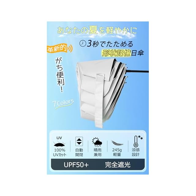 商品名:【3秒でスッキリ畳める】形状記憶 日傘 折りたたみ 軽量 uvカット 100%遮光 折り畳み傘 自動開閉 コンパクト 遮熱 晴雨兼用 日焼け止め 紫外線遮断 耐風 携帯便利 メンズ レディース (ホワイト)