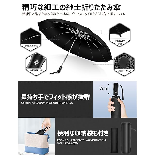 強風でも壊れにくい【12本超強靭な骨組みで強化型傘】☂✅ 様々な意見をまとめて、弊社新作の晴雨兼用傘ががようやく登場!柔軟性と強度を併せ持つ12本親骨を採用し、普通の8傘本骨より、耐風性と耐久性ともに向上させた、防食加工が施された傘のフレームは超強靭で錆びにくい上に、強風にあおられても豪雨に打たれても折れたり曲がったりしにくいです。3段折り構造により、強風で裏返ってもちゃんと元に戻ります。安易に折れたり曲がったりする心配ありません。梅雨はもちろん、豪雨、強風にも安心できます。男性の方が求める機能を全て取り入れた究極のメンズ傘です。(※通常の傘より少し重いですが、機能を重んじて傘の強度と大きさを求めて作られています。重さに気になる方は何卒ご理解のほどよろしくお願い致します。)