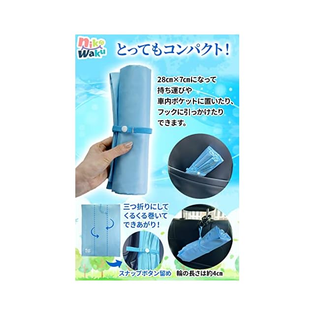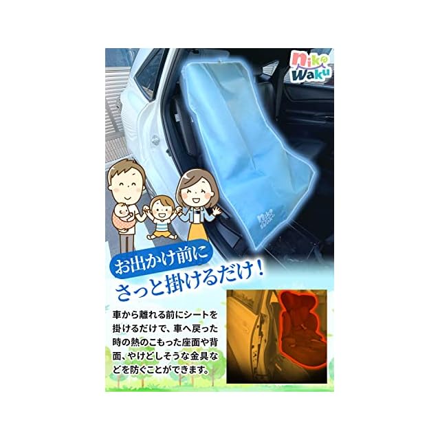 【真夏の車中 高温の座席対策!】真夏の炎天下で駐車した後の車内は、エンジン停止後わずか30分で約50℃を超えるといいます。チャイルドシートにはベルト金具などもあり、その部分は火傷になるほどの高温に!車から離れる前に、nikowakuの遮熱シートをサッとかけるだけで熱を遮断し、チャイルドシートの温度上昇を防ぎます。<br><br>【カーシートを熱から守る!】nikowakuの遮熱シートは、シンプルなスタイルで使いやすく高性能。厚みとハリがあるシートはカバーエリアが広くなるようフラットに仕上げました。素材の2重構造と色彩のもつ遮熱効果で、覆った部分の下へ熱が伝わりにくいので、遮熱シートを外したらお子様を指定席に座らせることが可能なります。<br><br>【車を離れる直前に掛けるだけ!】遮熱シートを広げ、ウラ面上部が袋状になっているので、チャイルドシートの上部分や、カーシートのヘッドレスト部分に掛け、シートを前へ垂らすだけ!保護した部分の温度上昇を和らげます。<br><br>【爽やかなお空色!】オモテ面は、遮熱効果の高い明るいパステルカラーを採用!ウラ面はオックスフォード素材にシルバーコーティングした2重構造。色効果と素材効果で高遮熱力を実現しました。厚みとハリがあり、しっかりした素材は長く愛用していただけます。<br><br>【コンパクトになる設計!】三つ折りにしてクルクルと丸め、付属の紐を巻きスナップボタンで留めればコンパクトに!先端が輪になっているので引っ掛け収納も可能です。<br><br>【ベビーカーにも!】野外へお出かけの際、ベビーカーからお子様を連れて離れる際、ベビーカーを放置する場面にも遮熱シートを掛けておけばOK! 公園、プール、テーマパーク、海、山、川など携帯してお使いいただけます!<br><br>【】安心安全の45日間書を付属いたしております。 不良や故障の際には、スタッフが誠心誠意対応致しますので、お気軽にお問い合わせ下さい。 迅速に返金、もしくは新品の再配送をさせて頂きます。<br><br>【サイズ】ヨコ約74cm ×タテ約95cm 裏面袋状部分約20cm ※サイズは手測りの為、若干の誤差が生じますのでご了承ください。 ヒモ長さ約31cm 引っ掛け部分の輪長さ約4cm<br><br>【素材】ナイロン/ポリエステル ウラ:オックスフォード/シルバーコーティング<br><br>【カラー】ブルー(裏面シルバー)