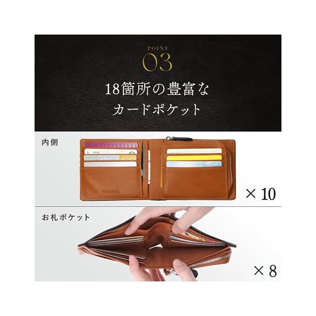 【圧倒的な収納力】お財布内側に10枚とお札入れに8枚のカードケースがついており、カードは最大で18枚も収納可能です。さらにはお財布外側の出し入れしやすいフリーポケットも収納として使用できます。