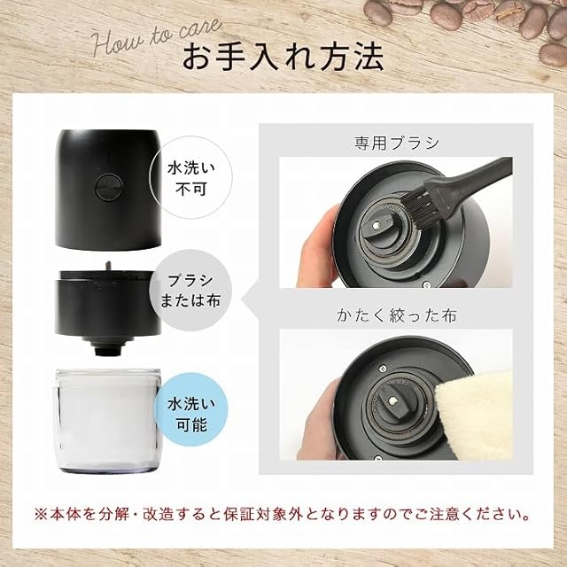 【水洗い可能】透明カップ部分のみ水洗い可能。モーター部分、グラインダー部分は水洗い不可。※グラインダー部分は付属のブラシ、固く絞った布でのお手入れをお願い致します。