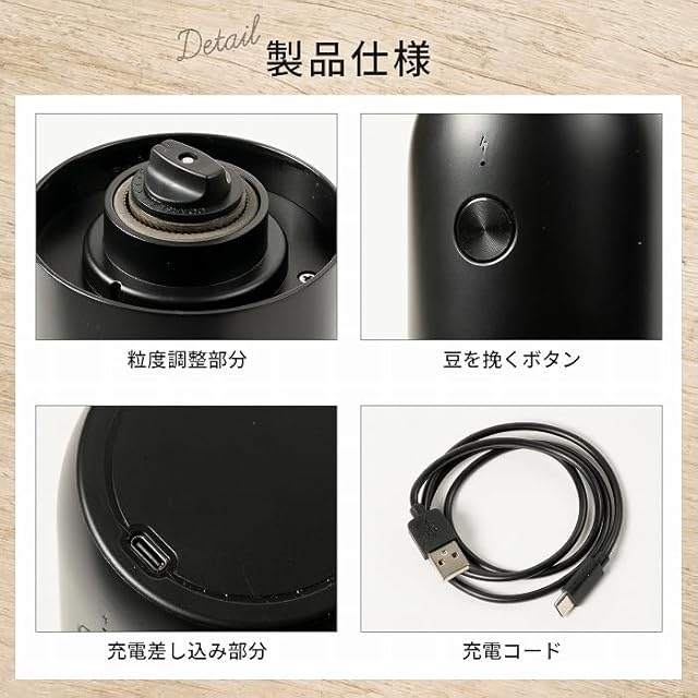 商品名:コーヒーミル 電動 臼式 セラミック製の刃 自動停止 無段階調整設定 USB充電式 バッテリー内蔵 1800mAh ミルミキサー 掃除ブラシ付 お手入れ簡単(ブラック)