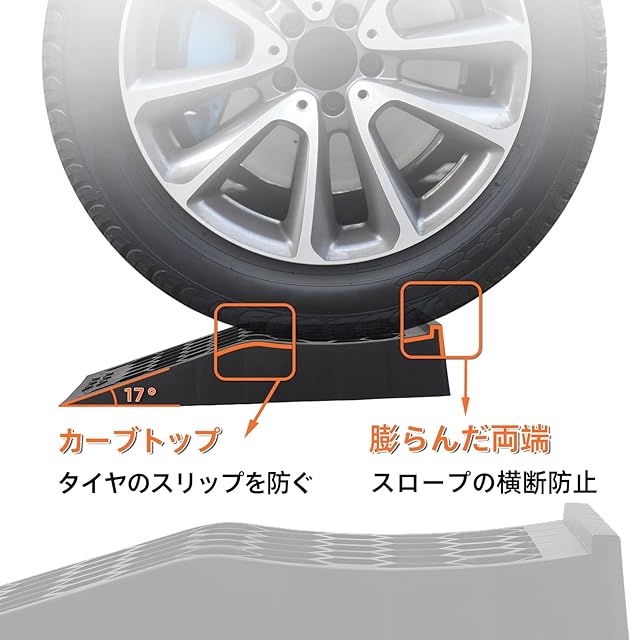 「ロープロファイルデザイン」:このステップスロープのサイズは430mm x 236mm x 80mmで、積載角度は17°で62mmのリフトアップが可能です。車高の低い車、スポーツカー、キャンピングカーに最適で、前進時に車を擦ることがありません